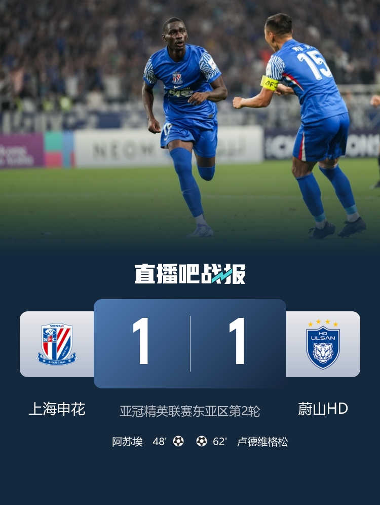 最终,经过90分钟的激烈较量,上海申花与蔚山HD战成1-1平局。申花积分仍止步于1分,暂时位于小组第9,而蔚山HD收获4分,位列第4。