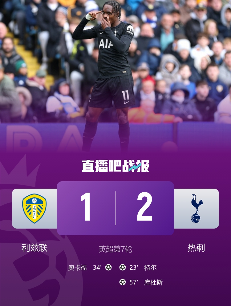 在10月4日晚7点30分进行的英超第7轮比赛中,利兹联主场迎战热刺。经过一场激烈的较量,热刺最终以2-1战胜了对手,这场胜利也为热刺带来了在英超中的首场胜利,结束了之前的两场平局。