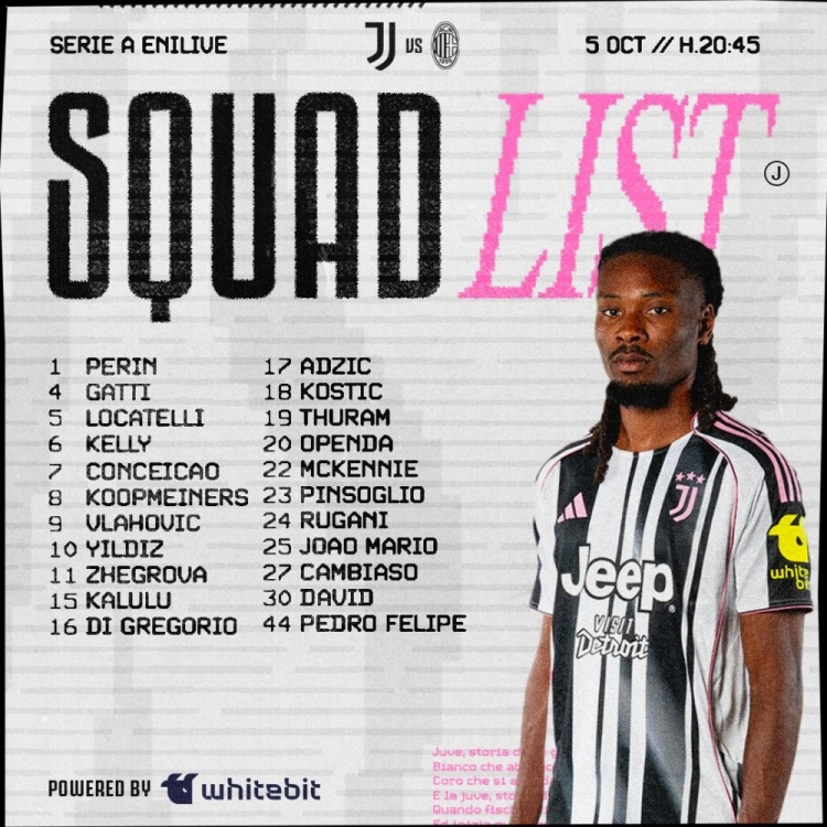 在门将位置上,尤文将派出1号佩林、16号迪格雷戈里奥和23号平索里奥。后防线上,有4号加蒂、6号凯利、15号卡卢卢、24号鲁加尼、27号坎比亚索和44号佩德罗-费利佩为球队保驾护航。进入中场的阵容中,尤文选拔了5号洛卡特利、8号库普梅纳斯、17号阿季奇、18号科斯蒂奇、19号凯夫伦-图拉姆、22号麦肯尼和25号若昂-马里奥。前锋线则包括了7号小孔塞桑、9号弗拉霍维奇、10号伊尔迪兹、11号热格罗瓦、20号奥蓬达以及30号戴维。