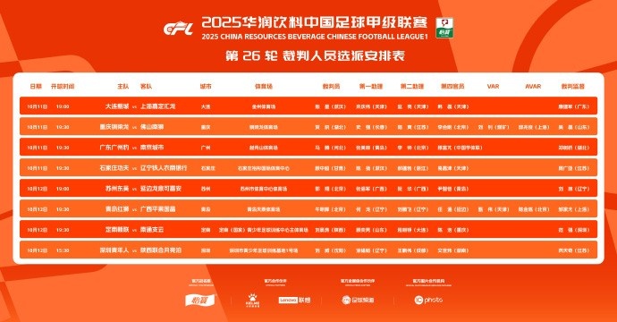 2025华润饮料中甲联赛第26轮的裁判选派结果已经公布。其中,重庆铜梁龙对阵佛山南狮以及青岛红狮对抗广西平果的比赛均配备了VAR裁判,这为比赛的公平性提供了有力保障。